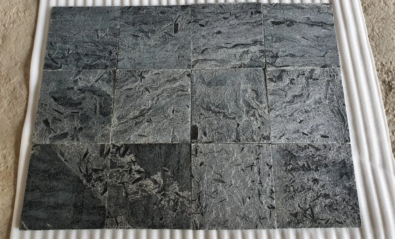 The formation of silver shine slate begins with sandstone which metamorphoses into quartzite slate through intense heat and pressure. This forces the sandstone to recrystallize resulting in a hard dense material which has a unique sparkle (granular appearance). The unique silver sheen comes from the presence of mica and other reflective minerals embedded in the stone.